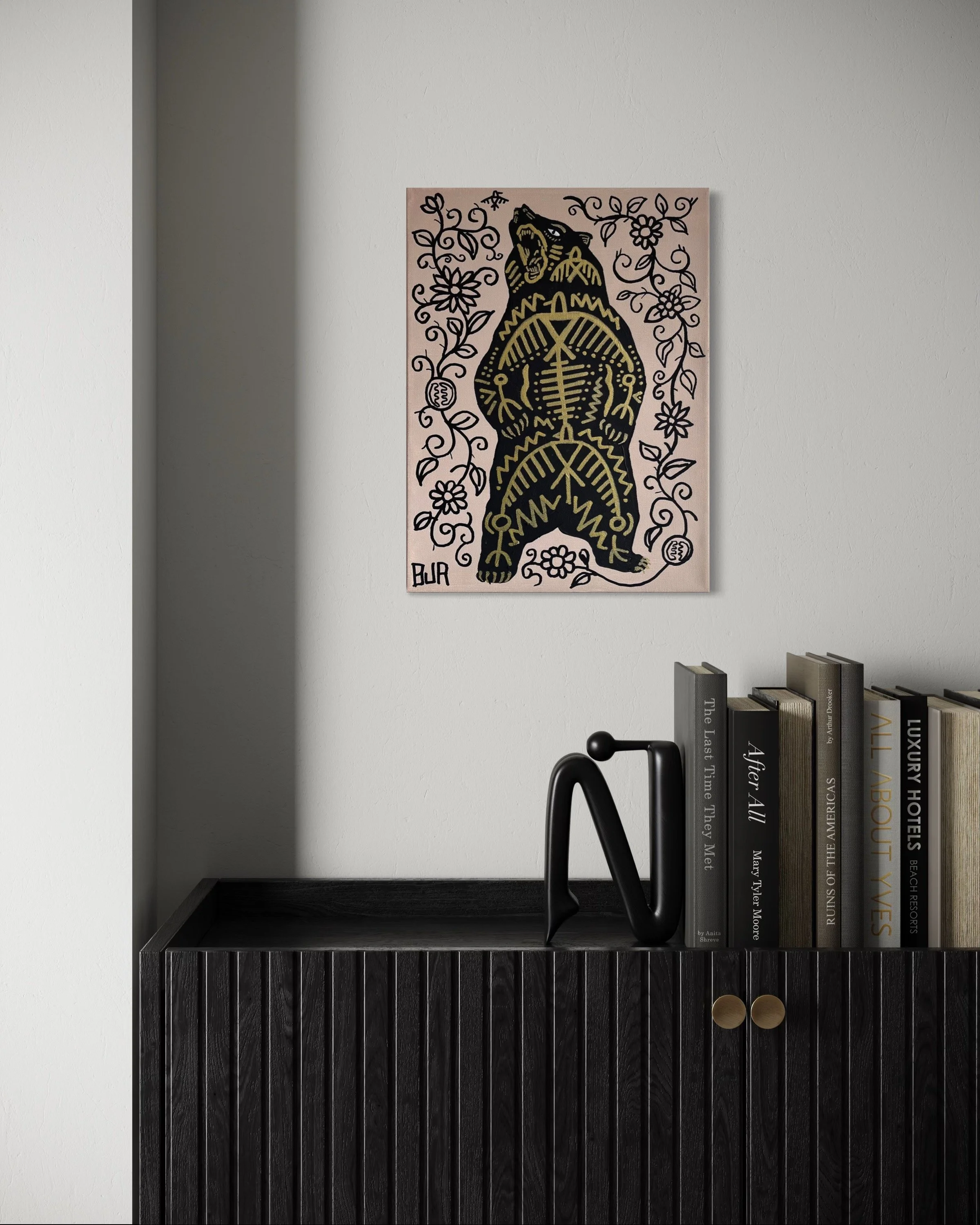 For Curio Atelier, that’s exactly what makes Bradley’s work so compelling: it carries the weight of those stories, but speaks them in a language that feels fiercely contemporary – part woodland, part punk show flyer, part amulet. These are paintings that don’t just sit quietly on the wall. They hold space, they protect, and they insist that old stories can be told in very new ways.
