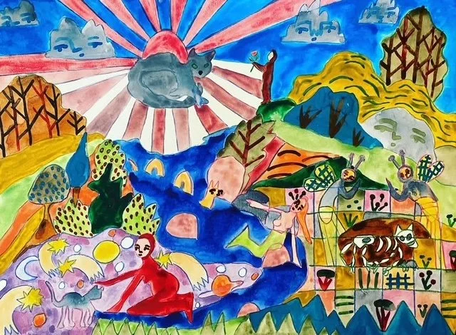 Her pieces are colourful and bold, packed edge-to-edge with rivers, houses, owls, bicycles, angels, faces peeking out of windows and bushes. At first glance they feel like wonderful escapes – the sort of scenes you can disappear into when real life feels too sharp – but if you sit with them, they start to reflect reality back in a very honest way. Her worlds are playful, yes, but they’re also about grief, chronic illness, resilience, and the stubborn decision to keep going.