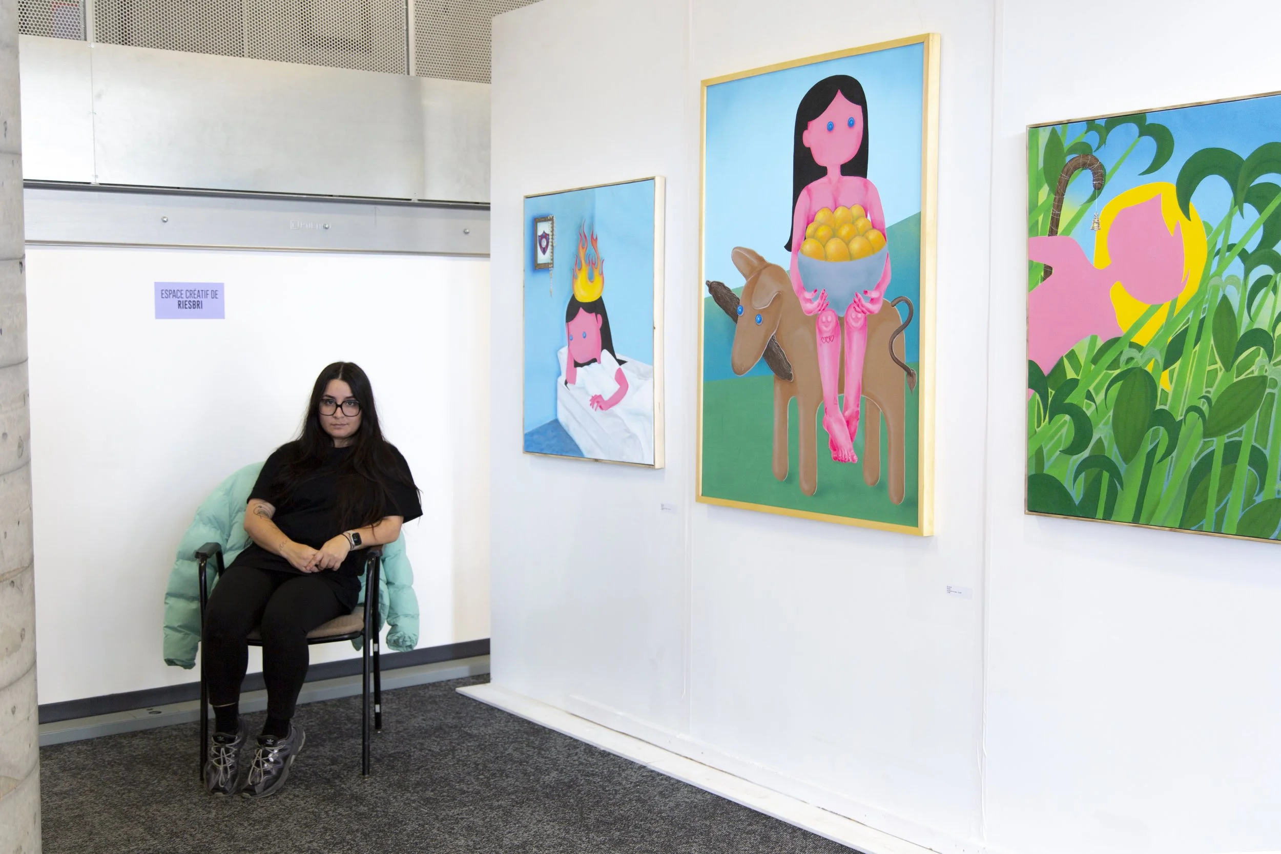 One of the first things you notice about Riesbri’s work is the cartoon-like language: rounded forms, simplified outlines, a kind of visual softness that feels immediately approachable. That’s very intentional.