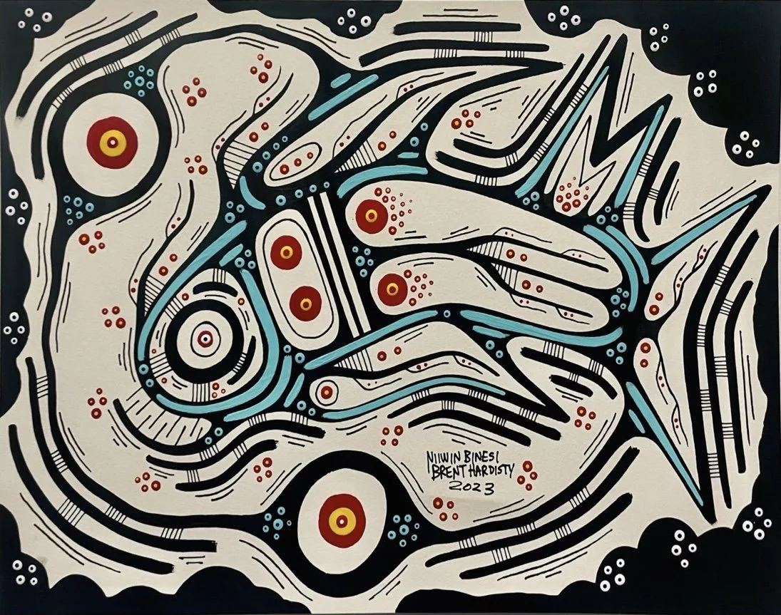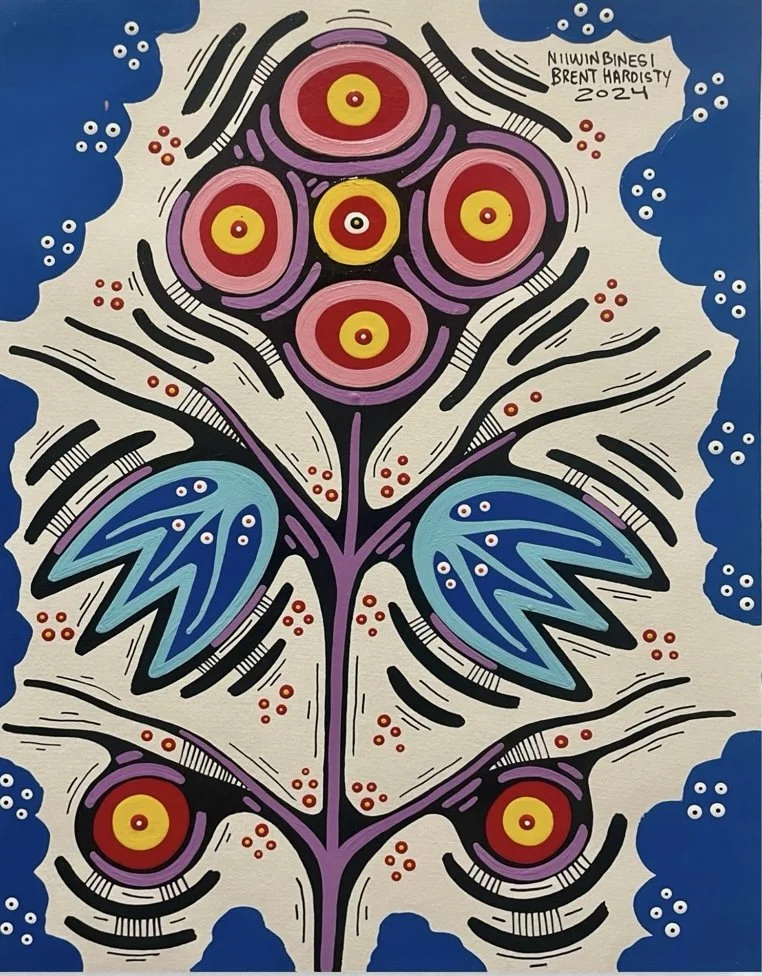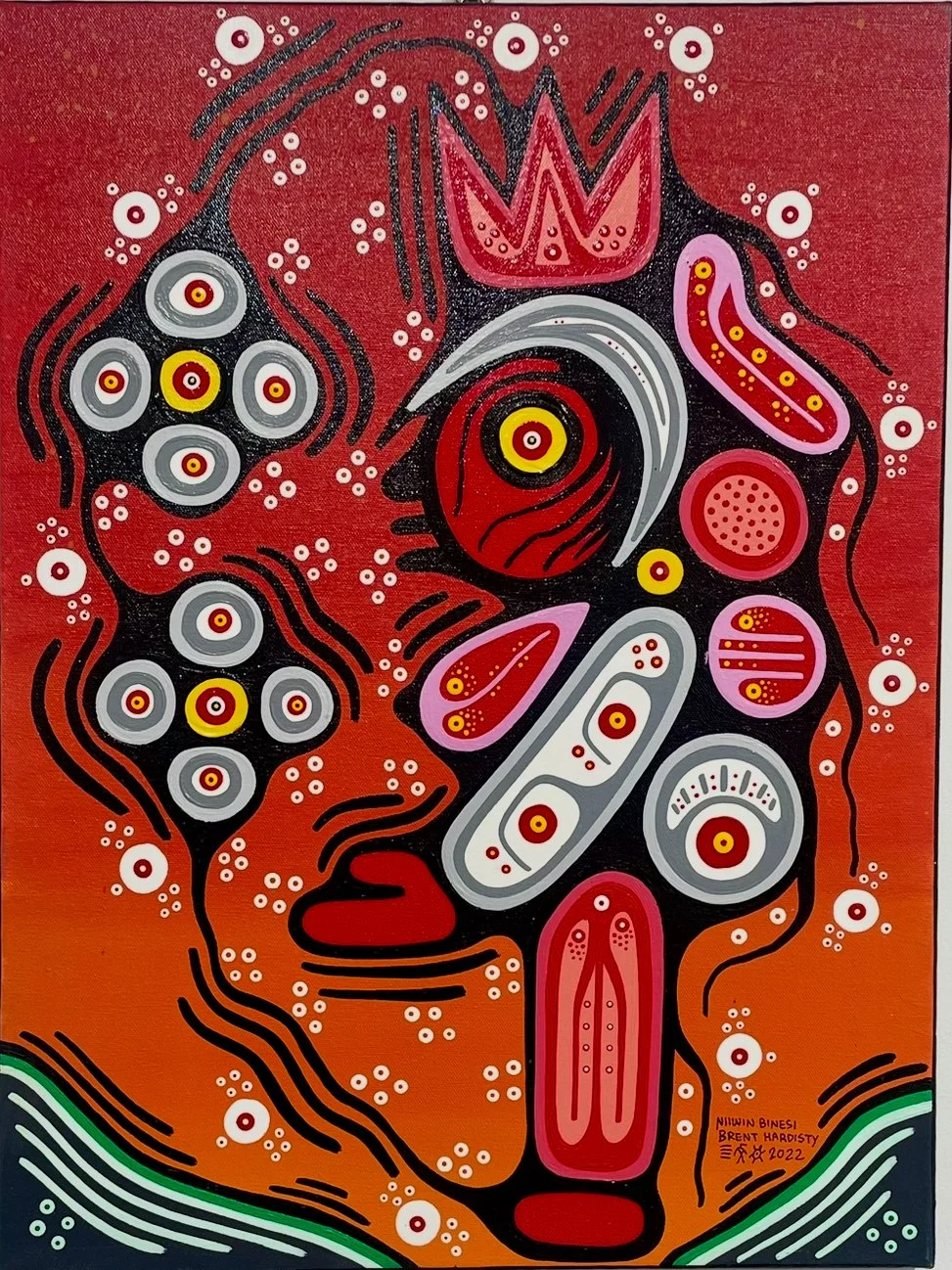 Brent Hardisty is a Woodland style painter working in acrylic on canvas. His spiritual name, Niiwin Binesi—“Four Birds” in Anishnaabemowin—refers to the Thunderbird, Golden Eagle, Bald Eagle, and Hawk. Raised in the Sagamok First Nation in Northern Ontario, Brent’s work blends the spiritual traditions of his community with the bold, graphic sensibilities shaped by his early years in Toronto’s graffiti scene. Influenced by Norval Morrisseau and artists such as James Simon Mishibinijima, Daphne Odjig, and Leland Bell, his paintings use vivid color and symbolic forms to explore deep spiritual connections and invite personal interpretation.