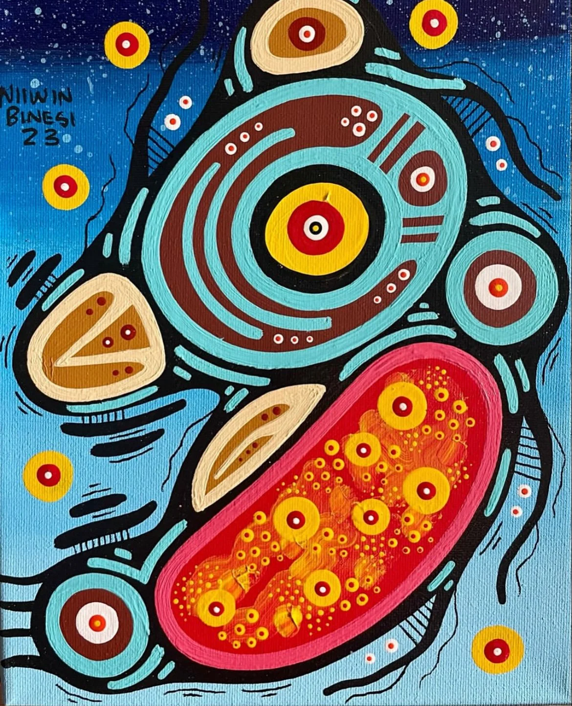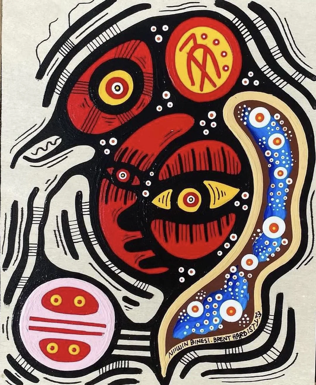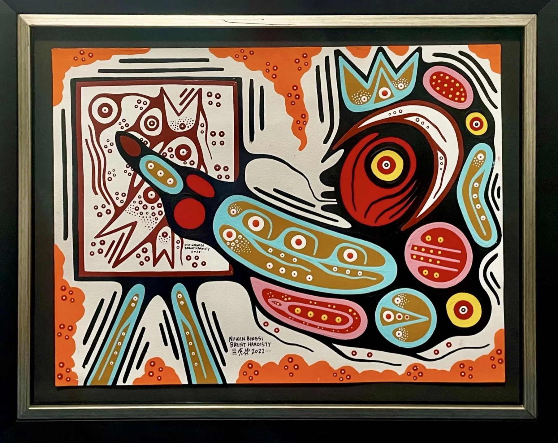 Brent Hardisty is a Woodland style painter working in acrylic on canvas. His spiritual name, Niiwin Binesi—“Four Birds” in Anishnaabemowin—refers to the Thunderbird, Golden Eagle, Bald Eagle, and Hawk. Raised in the Sagamok First Nation in Northern Ontario, Brent’s work blends the spiritual traditions of his community with the bold, graphic sensibilities shaped by his early years in Toronto’s graffiti scene. Influenced by Norval Morrisseau and artists such as James Simon Mishibinijima, Daphne Odjig, and Leland Bell, his paintings use vivid color and symbolic forms to explore deep spiritual connections and invite personal interpretation.